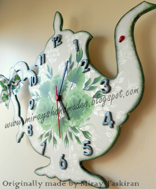 Merak edenlere yapım aşamaları sırasıyla; Öncelikle düşündüm :D(hahahaa!), çizdim, kestim, sayılarıda ince mdf den kestim (çok zorlandım,hazırları var,satın alabilirsiniz..Sonra 2.sinde polimer kille yaptım.;)..),açılması gereken delikleri açtım, zımparaladım, zemini boyadım, şablon ve metalik boya ile hareket verdim, One stroke (Tek darbe tekniği ile el boyaması) ile gül demetini boyadım, sayıları yapıştırdım,vernikle koruma altına aldım, saat mekanizmasını monte ettim, son olarak fiyonk ve metal objelerle tamamladım..Umarım yardımcı olabilmişimdir..